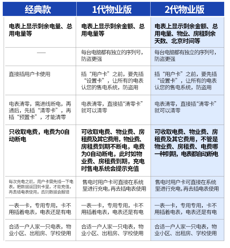 (2)預(yù)付費(fèi)電表的功能:經(jīng)典款電表是上顯示剩余電量、總用電量等,1代物業(yè)版電表上顯示剩余于金額、總用電量等,2代物業(yè)版電表上顯示剩余金額、總用電量、物業(yè)、房租剩余天數(shù)、北京時(shí)間等具體功能如下。