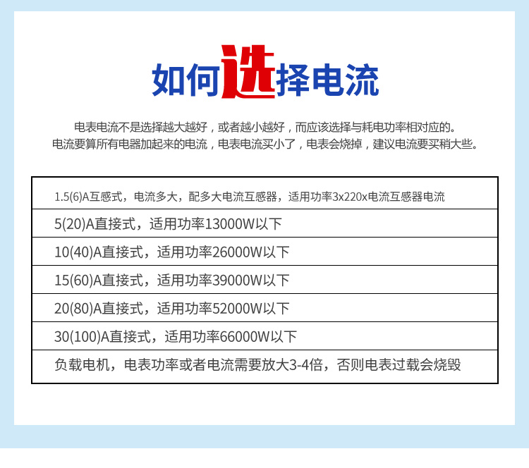 (五)三相預(yù)付費電度表(公用表)的選型:電表電流不是越大越好,或者越小越好,而應(yīng)選擇與使用功率相對應(yīng)的預(yù)付費電表,具體如下