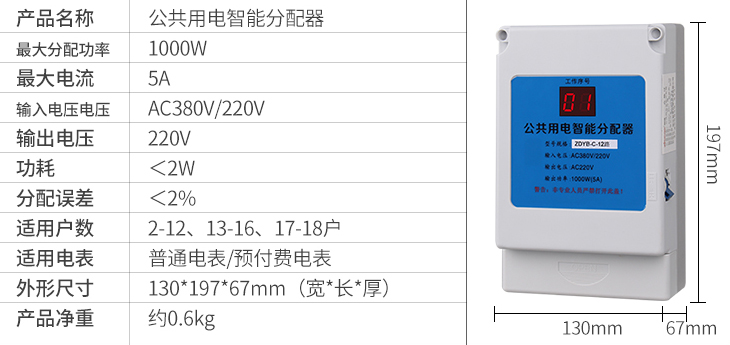 一、智盛牌公共用電智能分配器,是將公共樓道用電所消耗的電能(如樓道燈,對(duì)講防盜門(mén)等),自動(dòng)分配到各受益用戶的電表中。每天輪流接通一戶電表,開(kāi)機(jī)通電時(shí)第一戶電表隨機(jī)產(chǎn)生,達(dá)到公平分?jǐn)傠娰M(fèi)的目的,本款公共用電智能分配器的特點(diǎn):外置保險(xiǎn)絲更換方便,可實(shí)時(shí)顯示均分到哪戶。